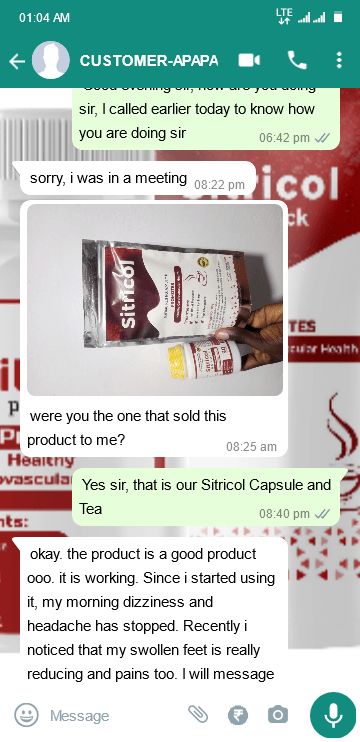 At that point, I knew Sitricol isnt just about the product. It is completely different from what I had tried in the past. She went further to say that She now buys Sitricol once in a while just for preventive measures – maybe once in 6 months. She talked about how the program helped reduce her swollen feet, stopped her constant headaches in the mornings, stopped her heart palpitation completely.