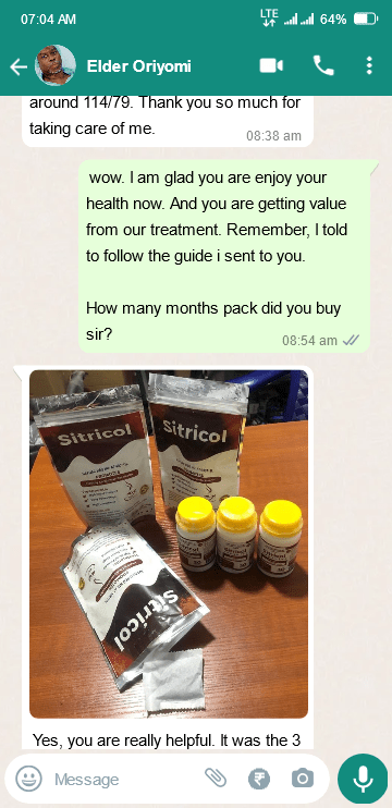 Within about 1 week of using the tea and capsule, I was really proven wrong. My bp began to drop gradually and my breathing pattern improved greatly. It was really really impressive. Just before the treatment finished, I had to reach out to my wife’s friend – Mrs Kalu to help with your office address in Ibadan, I wanted to get the treatment directly from the office.